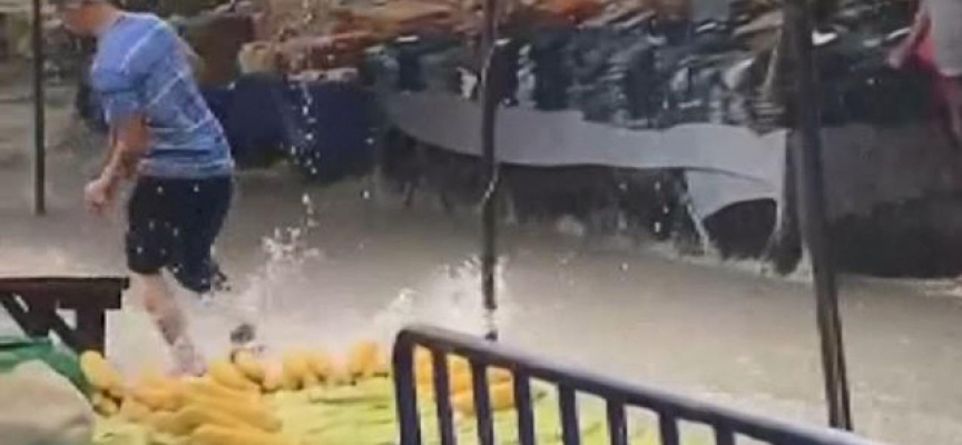 Yaklaşık yarım saat süren yağış nedeniyle Kanarya Mahallesi'ndeki Perşembe Pazarı'nda yollar göle döndü, pazar yerini su bastı.