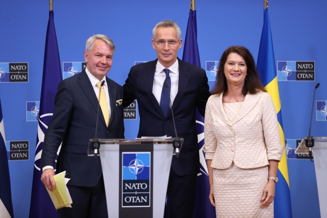NATO Genel Sekreteri Jens Stoltenberg, İsveç Dışişleri Bakanı Anne Linde ve Finlandiya Dışişleri Bakanı Pekka Haavisto ile iki ülkenin İttifak'a katılım protokollerinin imzalanması töreninin ardından ortak basın toplantısı düzenledi.