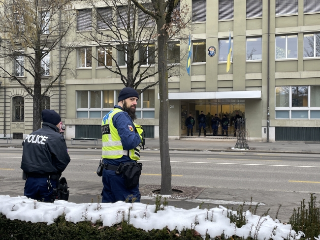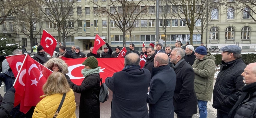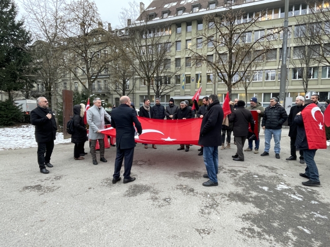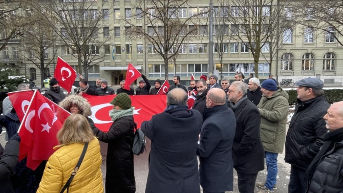 İsveç'in Bern Büyükelçiliği önünde, İsviçre'deki Türk sivil toplum kuruluşlarının (STK) çatı örgütü olan İsviçre Türk Toplumu (İTT) öncülüğünde düzenlenen protestoya İsviçre'deki Türk STK'lerin başkan ve yöneticileri katıldı.