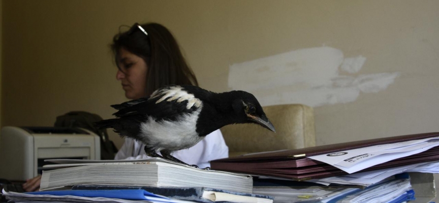 "Cambaz" adını verdiği karga yavrusunu elleriyle besleyen Yakar, Cambaz'ı evde yalnız bırakamadığı için her gün iş yerine götürüyor.