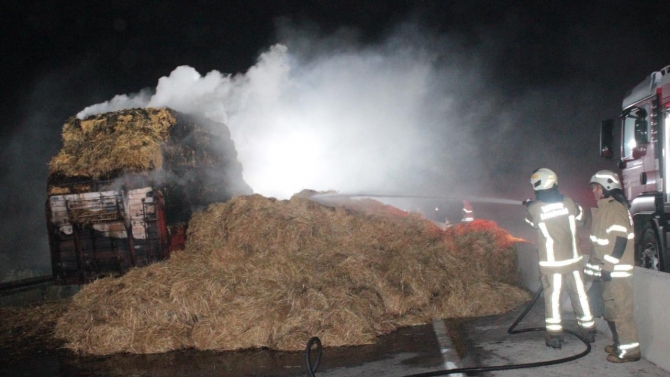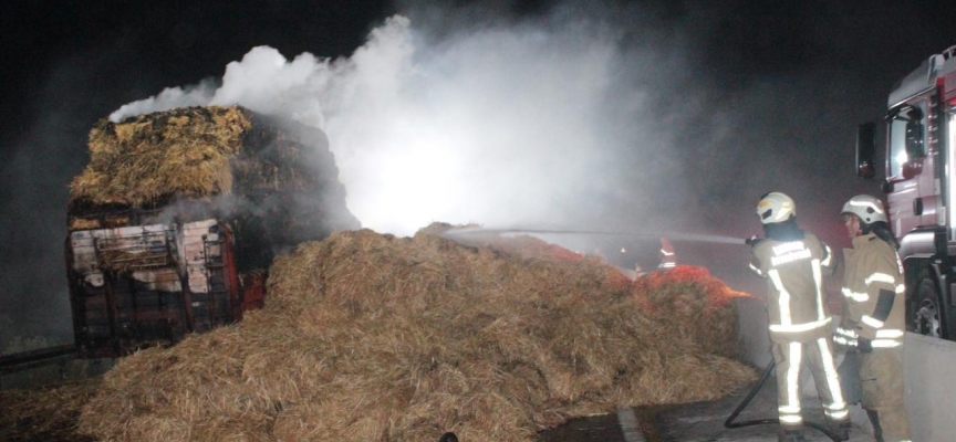 Hasan Can'ın kullandığı plakası öğrenilemeyen saman yüklü tırda Buruncuk Mahallesi yakınlarında henüz belirlenemeyen bir sebeple yangın çıktı.