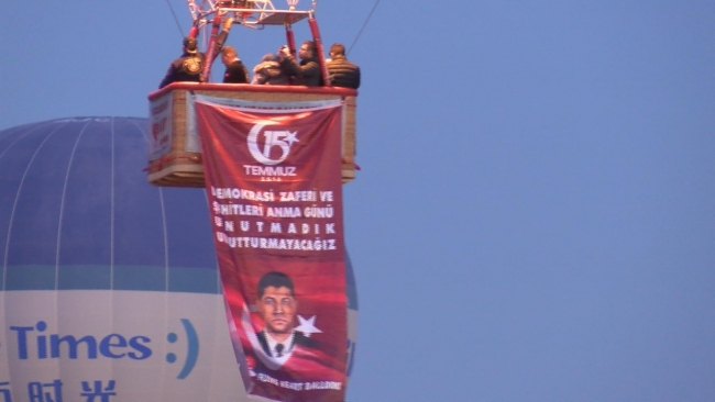 Sabahın ilk ışıklarıyla birlikte Avanos ilçesine bağlı Paşabağ mevkiinden havalanan sıcak hava balonlarına 15 Temmuz darbe girişiminin 6'ncı yıl dönümünde Türk bayrakları ve şehit Ömer Halisdemir'in posteri asıldı.