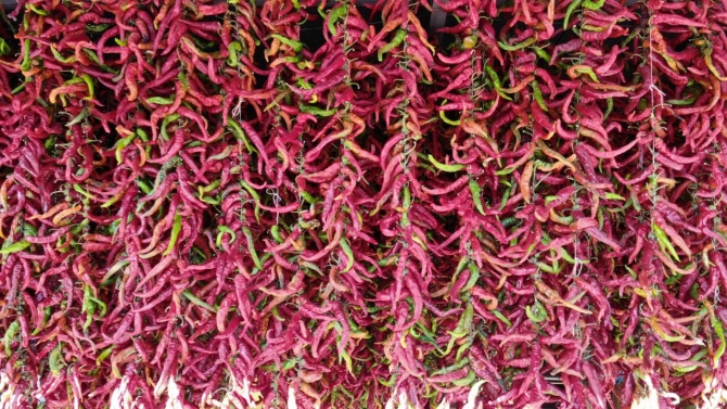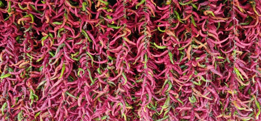 Haftalar öncesinden Yunanistan sınırındaki tarlalarda hasadı yapılan tava ciğerin olmazsa olmazı Karaağaç biberinde sıra iplere dizme ve kurutmaya geldi. İmece usulü tek tek iplere dizilen ve kurumaya bırakılan acı biberlerin en büyük özelliği ise gölgede ve nem oranının düşük olduğu hava şartlarında kurutuluyor olması.