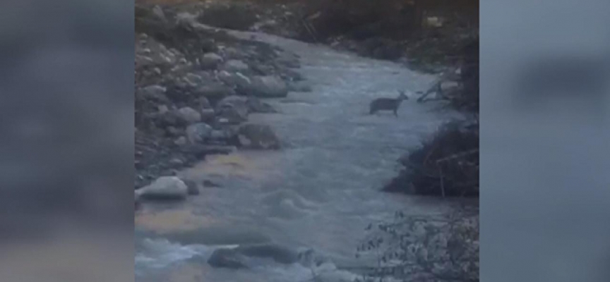 Görüntülerde, dere kenarında bekleyen karacanın daha sonra hızla dereden geçmesi yer alıyor.