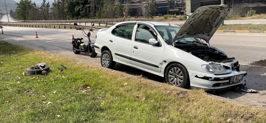 Çarpışmanın etkisiyle yol kenarındaki bariyere çarpan otomobilin tekeri koptu.