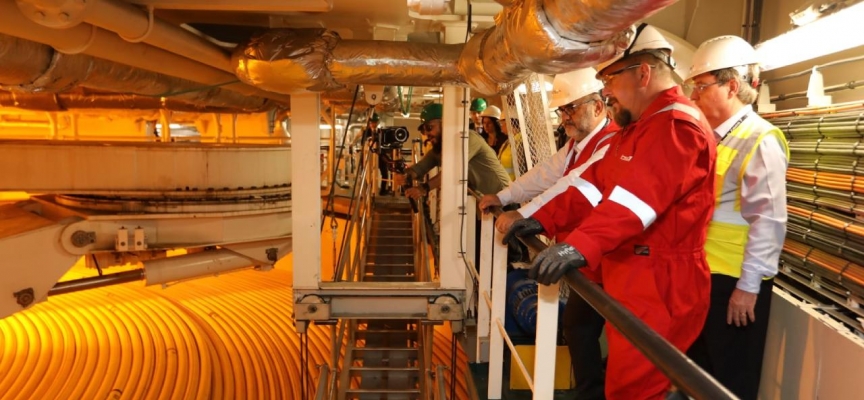 "Bunlardan birisi deniz tabanına yerleştirilecek olan ekipmanlar, diğeri karada yapılacak olan kara işleme tesisleri ve üçüncüsü de bunların arasındaki boru hatları... Bu boru hatları projesinin üçüncü bileşenini devreye sokmuş oluyoruz. Dolayısıyla aslında iki tane ana boru hattı, yardımcı boru hattı ve ana kontrol ünitesinin serilmesi işlemini tamamlayacak olan gemiyle çalışmalarımız tüm hızıyla başarılı şekilde devam ediyor.