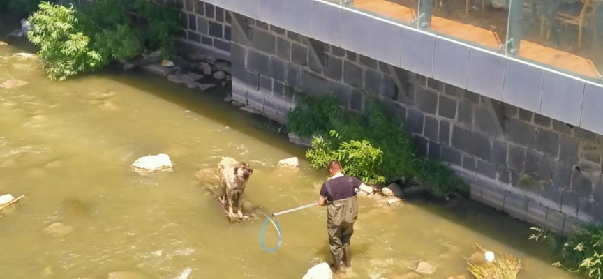 İhbar üzerine bölgeye gelen itfaiye ekipleri, köprünün yakınlarında bir taşın üzerine düşen köpeği kurtarmak için çalışma başlattı.
