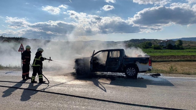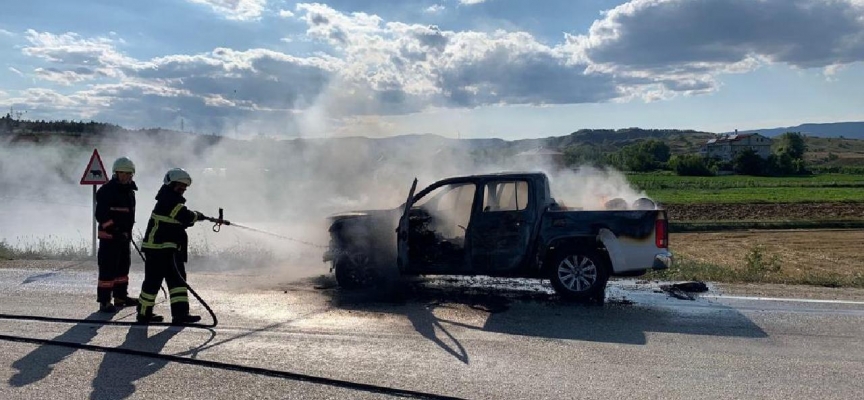 Kastamonu'nun Taşköprü ilçesinde Sinop'tan Bartın'a seyir halinde olan ve içerisinde 2 askeri personelin bulunduğu 001283 plakalı pikap, henüz belirlenemeyen nedenle alev aldı.