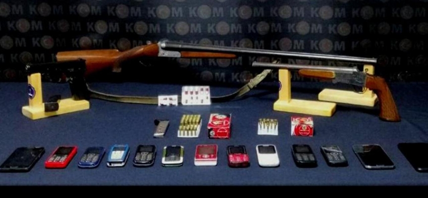 Kent merkezinde düzenlenen operasyonda ruhsatsız tabanca, ruhsatsız tüfek, IMEI'leri başka telefonlara yüklenmiş 15 kayıt dışı telefon, 11 sentetik uyuşturucu hap, çeşitli çaplarda 48 fişek ele geçirildi.