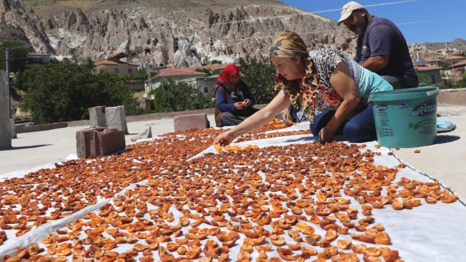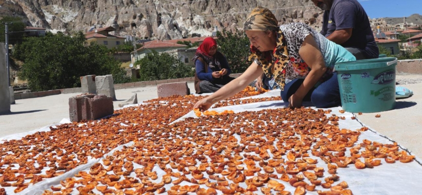 Kaya oyma yapılar ve peribacaları bulunan Keşlik Mahallesi'nde de bugünlerde tatlı bir telaş yaşanıyor. İmece usulü toplanan kayısıların "sofralık" olanları taze olarak tüketilmesi için ayrılırken, geri kalanı ise kışın kullanmak için kurutuluyor.