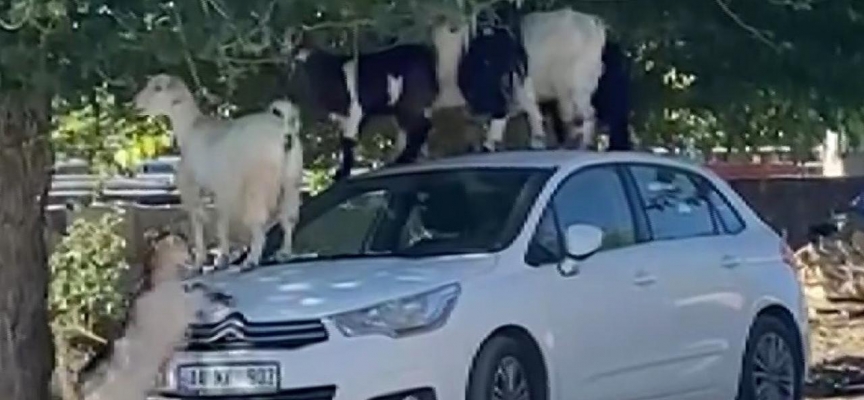 Keçiler, park halindeki otomobilin üzerine çıkarak yaprakları yemeye başladı.