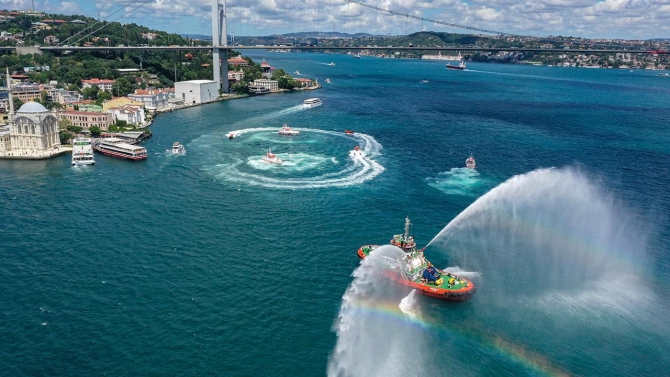 Burada köprü altından Avrupa Yakası sahil bandına geçen araçlar, Beşiktaş istikametinde Ortaköy Meydanı önünde su gösterisi yaptı. Daha sonra Üsküdar açıklarına hareket eden deniz taşıtları, Üsküdar Meydanı önünde de su gösterisi gerçekleştirdi.