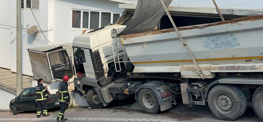 Bir süre sonra yerinden kendiliğinden hareket eden tır, yokuştan inerek yol kenarındaki bir araç servisinin yıkama bölümüne çarparak durabildi.
