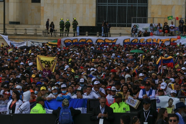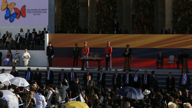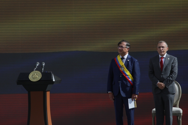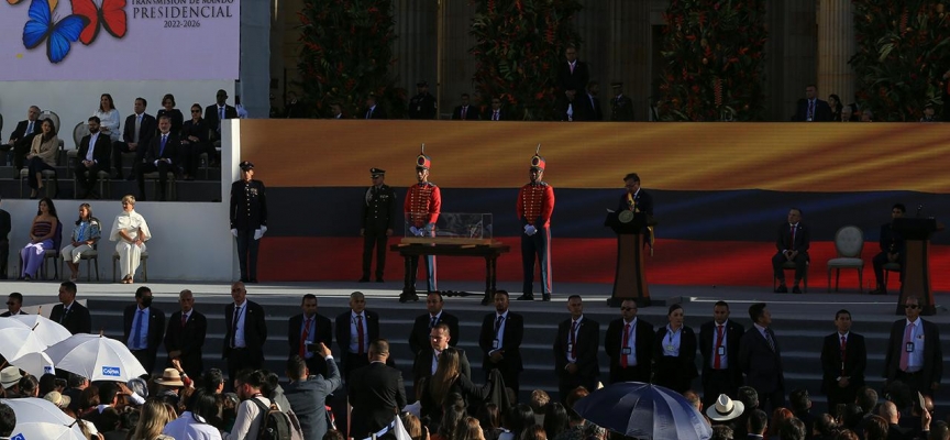 Petro, tarihi Bolivar Meydanı'nda düzenlenen ve 100 bin kişinin katıldığı törende, Cumhuriyet Kongresi Başkanı Roy Barreras tarafından başkanlık kuşağının kendisine takdim edilmesinin ardından cumhurbaşkanlığı görevini Ivan Duque'den devraldı.