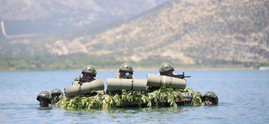 Zorlu kursu tamamlayabilmek için yoğun çaba sarf eden komandolar, 8 aya yakın süren komando kursunun aşamalarından "su üstü harekatı" eğitimini de aldı.