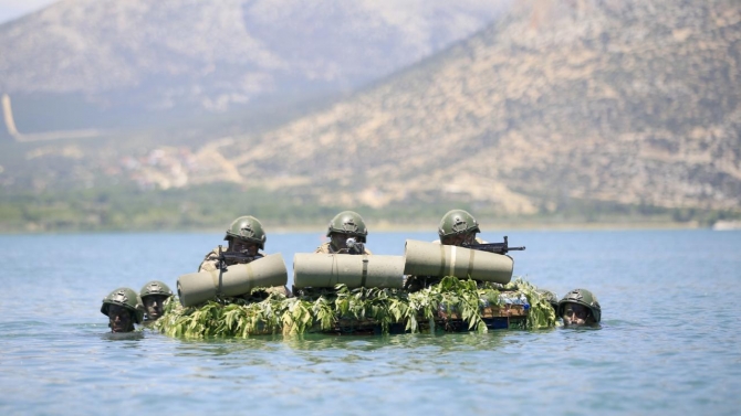 Mavi bereli Türk komandoları, senaryo gereği denizden botlar ile hiç beklenmedik zamanda ve yerden kıyıya yaklaştı. Karaya yaklaştıklarında devirdikleri botla kamufle olan komandolar yüzerek ilerledi.