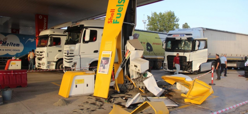 Burada sürücünün direksiyon hakimiyeti kaybetmesi sonucu tır, akaryakıt pompasına çarptıktan sonra durabildi.