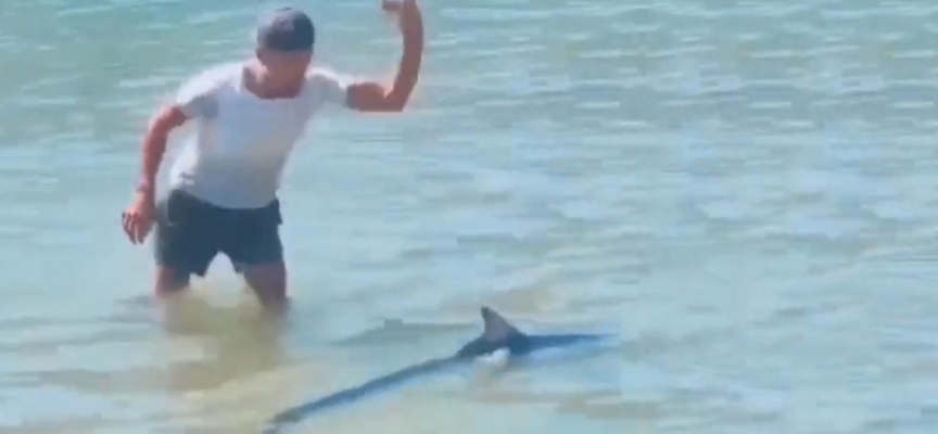 Turistler, köpekbalığı zannettikleri Akdeniz zarganası nedeniyle panik içinde denizden çıkarken, bir kişi ise çevresinde yüzen deniz canlısını sersemleterek kuyruğundan yakaladı.