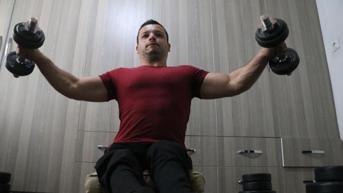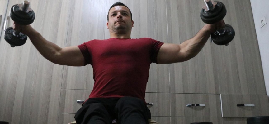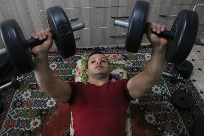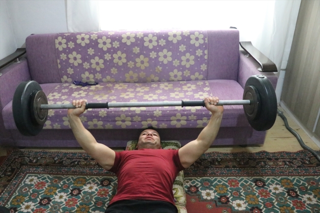 "Ben de 'madem salona gidemiyorum o zaman evimde çalışırım' dedim. Bir yakınımın desteğiyle kısa kalan setin çubuğunu hurdadan demir çubukla uzattım, odadaki yastıkları destek minderi yaptım, bench press sehpam yok, ağırlığı kanepenin üzeri koyarak çalışıyorum. Önceleri can sıkıntısından çalışıyordum. Müsabakada derece alınca işi ciddiye aldım. Şimdi günde iki antrenman yapıyorum."