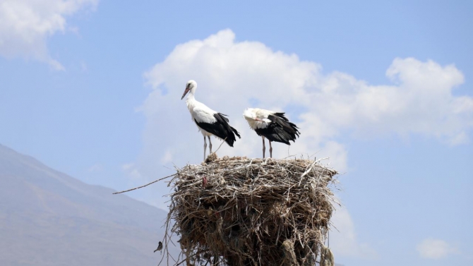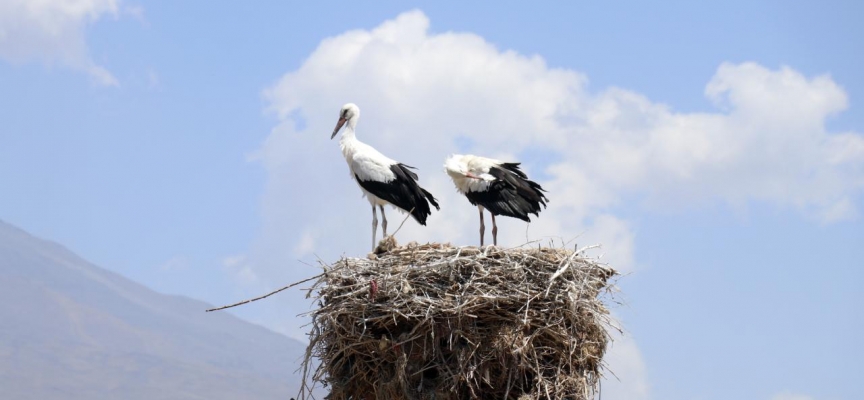 5137 metre rakımıyla Türkiye'nin en yüksek dağı olan Ağrı Dağı'na yakın noktadaki köyde yıllar önce eski bir aydınlatma direğine yaptıkları yuvada yaşamını sürdüren leylekler de yıllardır köy ve çevresinden göç etmiyor.