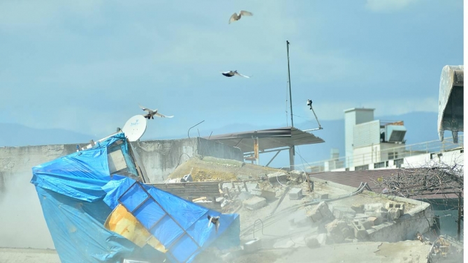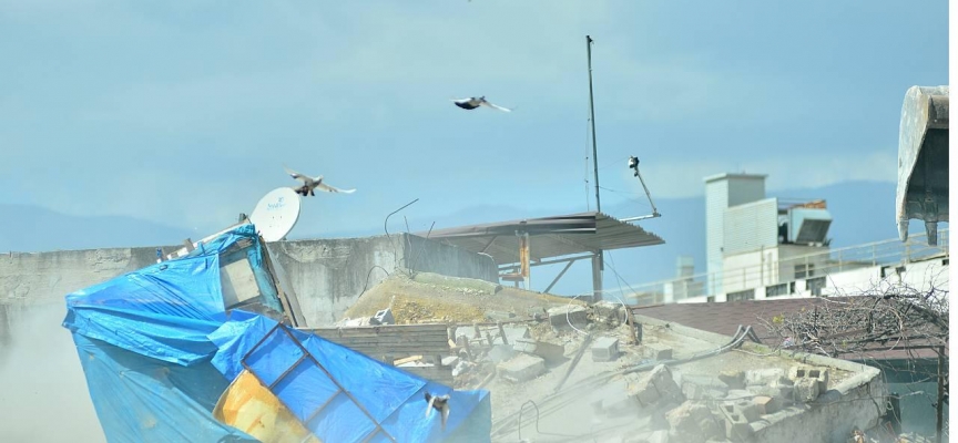 Operatör daha sonra binayı yıkmaya başladı. Bu sırada çatıda, iş yeri sahibine ait olduğu sanılan güvercinlerin kümesi de yıkıldı.