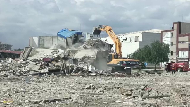 Ekskavatör operatörü, binanın üst katındaki iş yerinden ısıtıcı, vantilatör ve otomobil lastiklerinin de aralarında bulunduğu bazı eşyaları dışarı çıkardı.