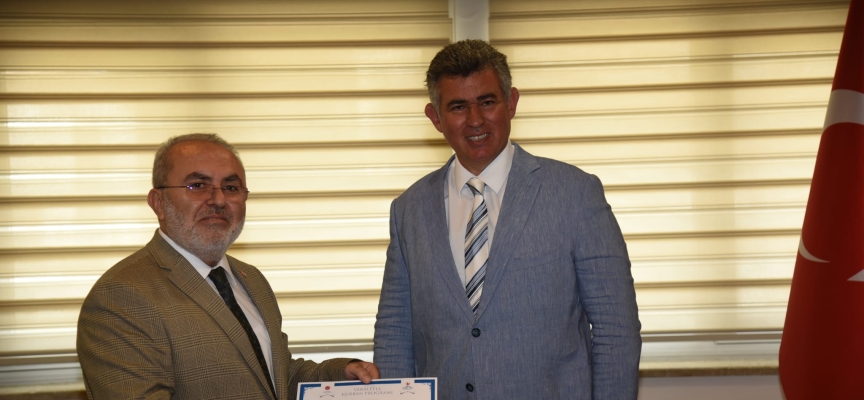 Abdülkadir Boşal, Büyükelçi Feyzioğlu’na yaptığı bağıştan dolayı belge takdim etti.