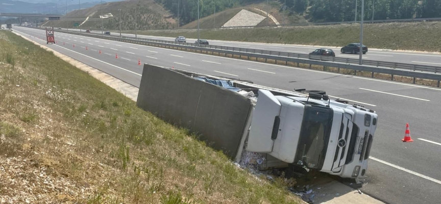 İstanbul yönünde seyreden İ.A. idaresindeki 68 AKK 578 plakalı geri dönüşüm kağıdı yüklü tır, Sevindikli gişeleri mevkisinde yol kenarına devrildi.