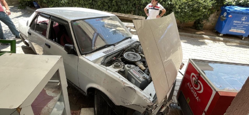 Sürücünün kontrolünden çıkan otomobil bir apartmanın zemin katında bulunan bakkalın duvarına çarparak durdu.