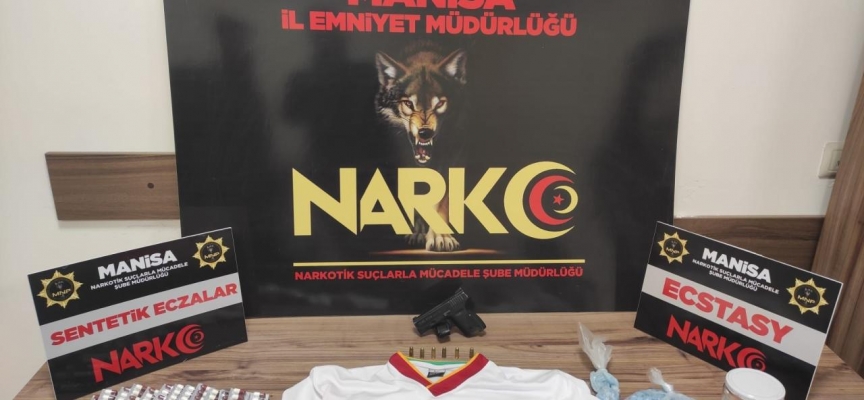Manisa İl Emniyet Müdürlüğü Narkotik Suçlarla Mücadele Şube Müdürlüğü görevlilerince uyuşturucu veya uyarıcı madde ticareti yapan, nakleden ve kullanan şahıslara yönelik yapılan çalışmalarda Şehzadeler ilçesinde bir ikamette yapılan aramada; 662 adet ecstasy hap, 447 adet sentetik ecza hapı, 1 adet 7,65 mm ruhsatsız tabanca, 6 adet 7,65 mm fişek, 1 adet bez parçası ele geçirildi.
