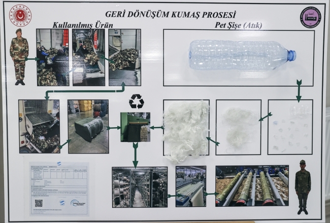 Daha sonra bu elyaflara kullanılmış pet şişelerden elde edilen polyester elyafı takviyesi yapılarak iplik üretildi. Bu iplikler, dokuma tesisinde yeniden eğitim elbiselik kumaş haline getirildi. Geri dönüşüm işlemi sonrasında ortaya çıkan kumaşın Mehmetçiğin kullanım konforu ile ihtiyacı olan diğer tüm teknik özellikleri sağladığı yapılan analizlerle tespit edildi.