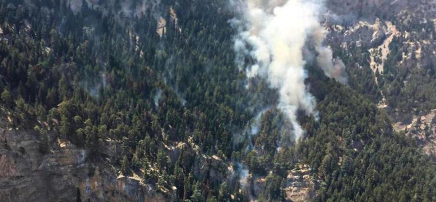 Ekipler, zorlu arazi koşullarında yangını kontrol altına almaya çalışıyor.