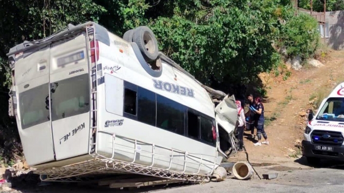 Tarım işçilerini taşıyan minibüsün sürücüsü, freninin boşalması nedeniyle direksiyon hakimiyetini kaybetti. Hızla ilerleyen minibüs devrildi.