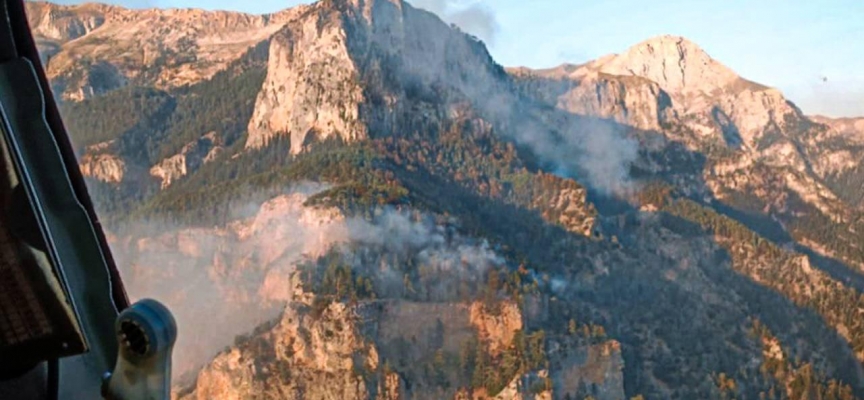 Ekiplerin, zorlu arazi koşullarında yangını söndürme çalışmaları sürüyor.
