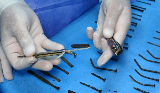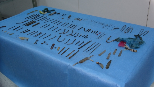 Hastanın midesinden tırnak makası, çakı, meyve bıçağı, cımbız, çivi, iğne, çuvaldız, tığ, vida, çengelli iğne, anahtar, madeni para, saç tokası gibi metal parçalarıyla plastik ve cam parçaları çıkarıldı.