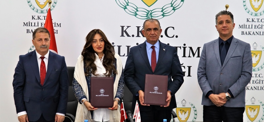 Protokole, Milli Eğitim Bakanı Nazım Çavuşoğlu ile Halil Falyalı Yardım Vakfı Başkanı Özge Taşker Falyalı imza koydu.