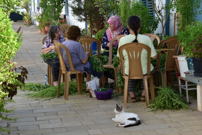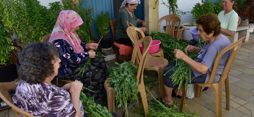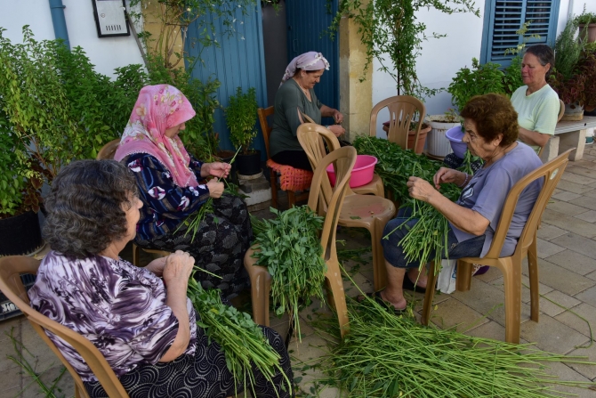 Başkent Lefkoşa’da tarihi Samanbahçe evleri bölgesinde bir araya gelen komşular, hem molehiya ayıklıyor hem de sohbet ediyor.