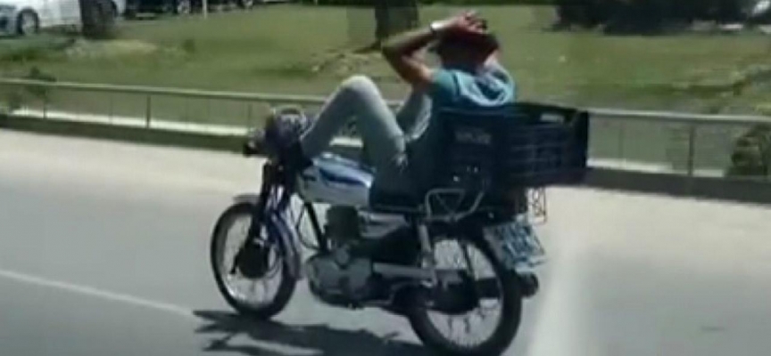 D-400 kara yolunda bir kişi, motosikletin koltuğuna uzanıp direksiyonu ayağıyla kontrol ederek trafikte ilerledi.