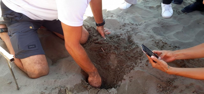 Sarıgerme Mahallesi'ndeki bir otelin mavi bayraklı plajında, şezlongların arasında kaplumbağa yuvası olduğunu gören otel yetkilileri, durumu, Deniz Kaplumbağaları Araştırma Kurtarma ve Rehabilitasyon Merkezi'ne (DEKAMER) bildirdi.