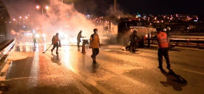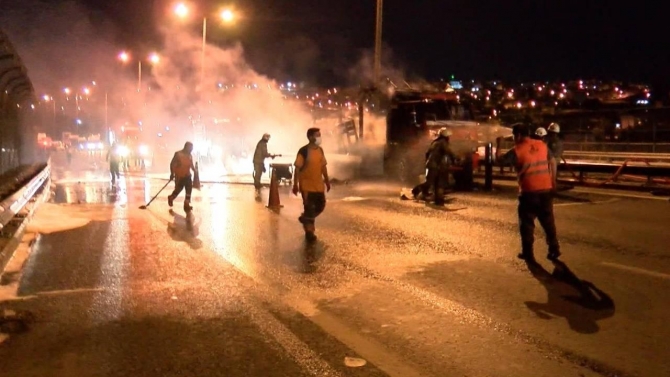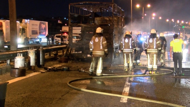 Saat 03.00 sıralarında, TEM Otoyolu Yarımburgaz Viyadüğü'nde derz çalışması yapıldığı esnada, kasasında oksijen tüpleri bulunan kamyonda yangın çıktı.