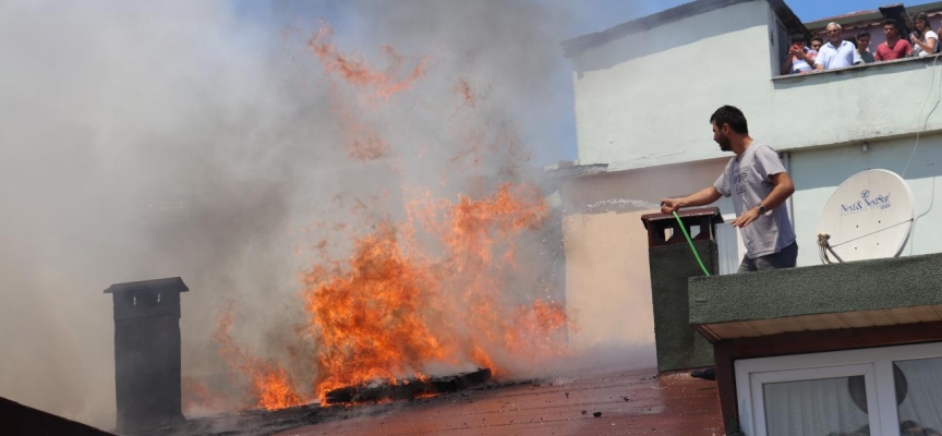 Öte yandan yangının sıçradığı üçüncü binada yaşan Fatih Kaymak, evinden çektiği hortumla çatıdaki alevlere müdahale etmeye çalıştı.