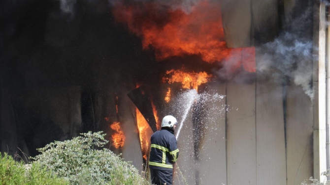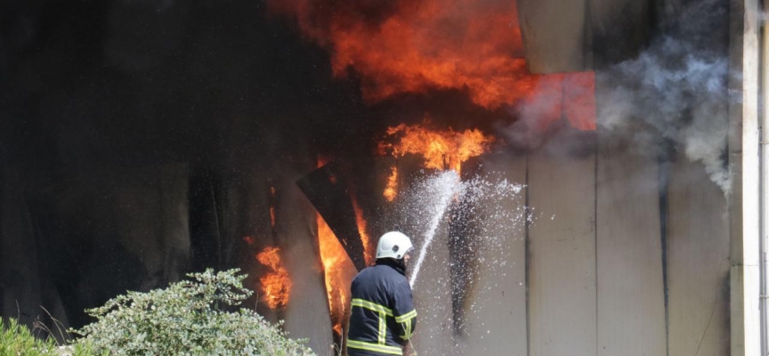 Polis ekiplerinin tesis çevresinde güvenlik önlemi aldığı yangına itfaiye müdahale ediyor.