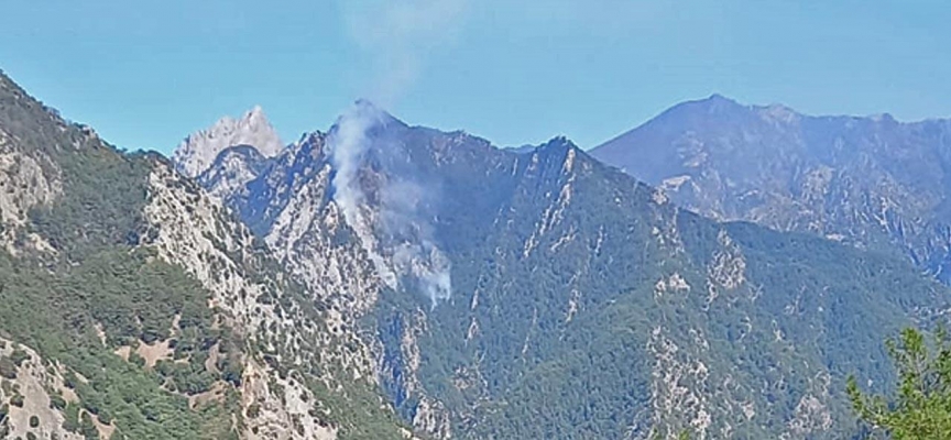 Ekiplerin, sarp arazi yapısı nedeniyle karadan ulaşmakta güçlük çektiği alevler, havadan müdahaleyle kontrol altına alınmaya çalışılıyor.