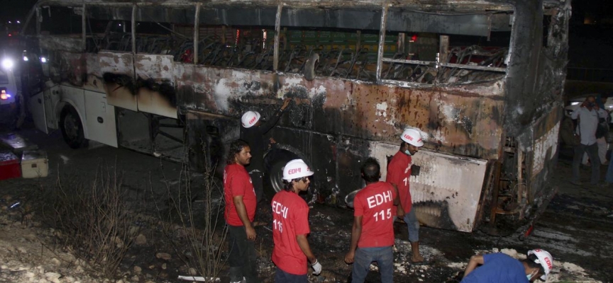 Ulusal basındaki haberlere göre, dün geç saatlerde Karaçi'den Khairpur Nathan Şah şehrine giden, içerisinde 80 kişinin bulunduğu otobüs, klima ünitesinde çıkan yangın sebebiyle Nuriabad kasabası yakınlarında alev aldı.