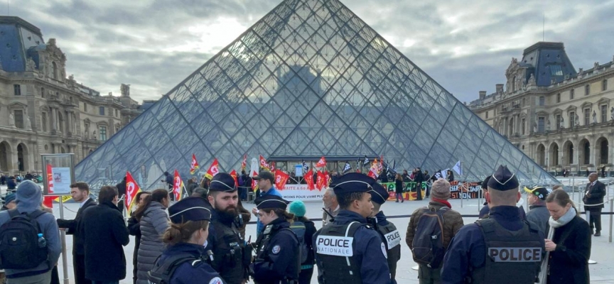 Genel İş Sendikası (CGT) bünyesindeki kültür çalışanları, ellerinde sendikanın bayraklarıyla müzenin avlusunda bulunan cam ve metalden oluşturulmuş piramidin önünde toplandı.