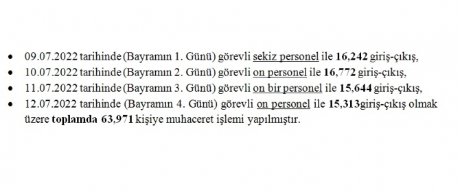 “ Bayramın 1. günü görevli sekiz personel ile 16,242 giriş-çıkış; bayramın 2. günü görevli on personel ile 16,772 giriş-çıkış; bayramın 3. Günü görevli on bir personel ile 15,644 giriş-çıkış; bayramın 4. günü görevli on personel ile 15,313 giriş-çıkış olmak üzere toplamda 63,971 kişiye muhaceret işlemi yapılmıştır”.