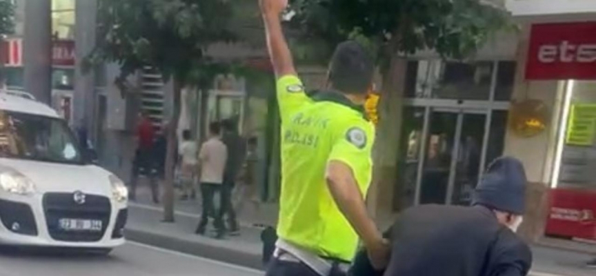 Trafik akışını bir süre durduran polis, yaşlı adamı güvenle karşıya geçirdikten sonra trafik akışını tekrar sağladı.