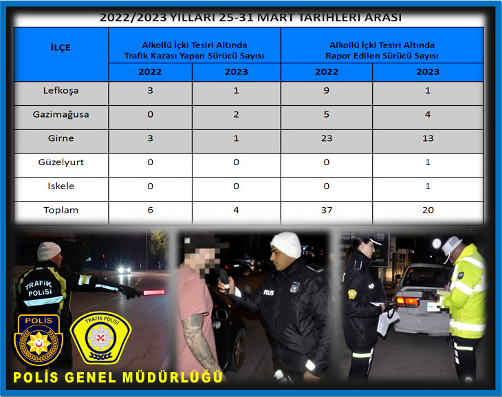 Polisin ülke genelindeki etkin trafik denetimleri sayesinde, alttaki tabloda da görüleceği üzere 2022 yılının 25-31 Mart tarihleri ile, 2023 yılının 25-31 Mart tarihleri arasındaki zaman diliminde, alkollü içki tesiri altında araç kullanıp trafik kazası yapan ve alkollü içki tesiri altında araç kullanıp rapor edilen sürücülerin sayısında azalma olduğu görülmektedir.