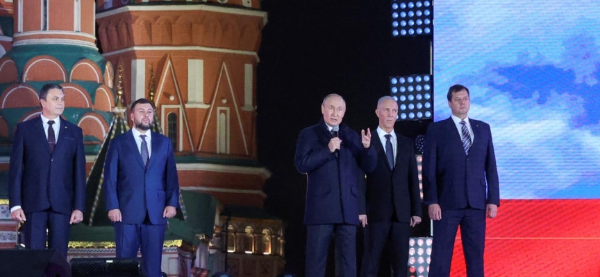 Putin, Ukrayna'nın Donetsk, Luhansk, Herson ve Zaporijya bölgelerinin Rusya tarafından ilhak edilmesine yönelik imzaladığı anlaşmaların ardından Kızıl Meydan'da düzenlenen etkinlikte konuştu.