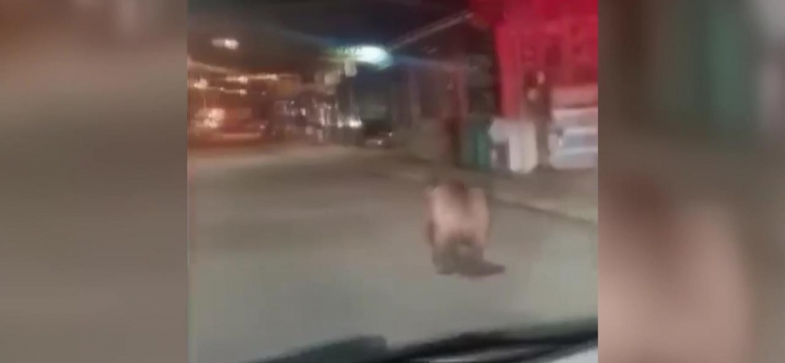 Caddede dolaşan ayıyı Serdar Şinaforoğlu otomobili ile takip ederek cep telefonu ile görüntüledi.